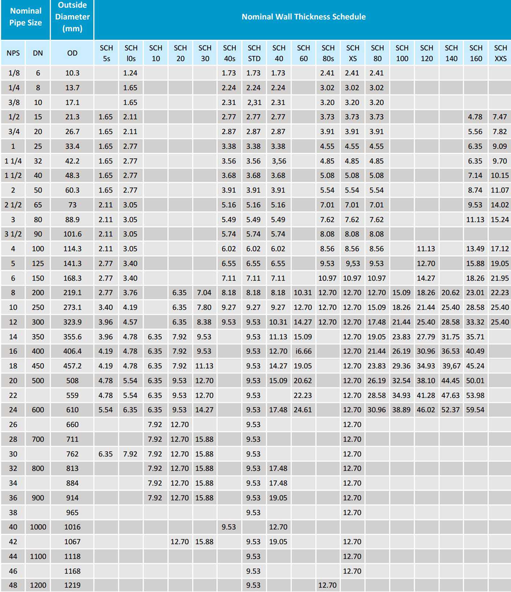 Steel pipe schedule is a indicating method represented by ASME B 36.10, and also used in many other standards, marked with “Sch”. Sch is the abbreviation of schedule, generally appearing in the American steel pipe standard, which is a prefix of a series number. For example, Sch 80, 80 is a pipe number from chart/table ASME B 36.10. “Since the steel pipe main application is to transport the fluids under pressure, so their internal diameter is their critical size. This critical size is taken as nominal bore (NB). Therefore, if steel pipe carry the fluids with pressure, it is very important that pipe shall have enough strength and enough wall thickness. So wall thickness is specified in Schedules, which means the pipe schedule, abbreviated as SCH. Here ASME is the given standard and definition for the pipe schedule.”